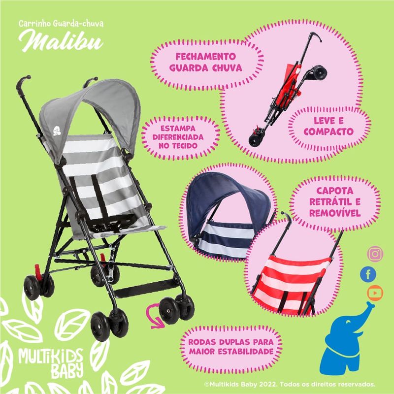 Sua estampa alinhada com as tendências da moda combina com diversão, segurança e praticidade. Super leve, o Malibu tem fechamento em estilo guarda-chuva, ficando super compacto depois de dobrado e fácil de carregar. Por isso ele é perfeito para qualquer passeio! Ideal para crianças a partir dos 6 meses, o Malibu pode ser usado até o peso de 15 kg. Sua capota redonda é retrátil e removível. As rodas duplas com istema giratório proporcionam maior estabilidade em terrenos mais acidentados. Sua estrutura resistente e cinto de segurança de 5 pontos trazem segurança pros bebês e tranquilidade pros pais.