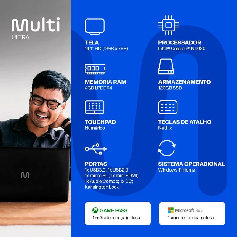 Notebook Ultra, com Windows 11 Home - Intel Celeron 4GB 120GB SSD 14,1 Pol. HD, Preto + Microsoft 365 Personal + 1TB na Nuvem - UB235OUT [Reembalado]